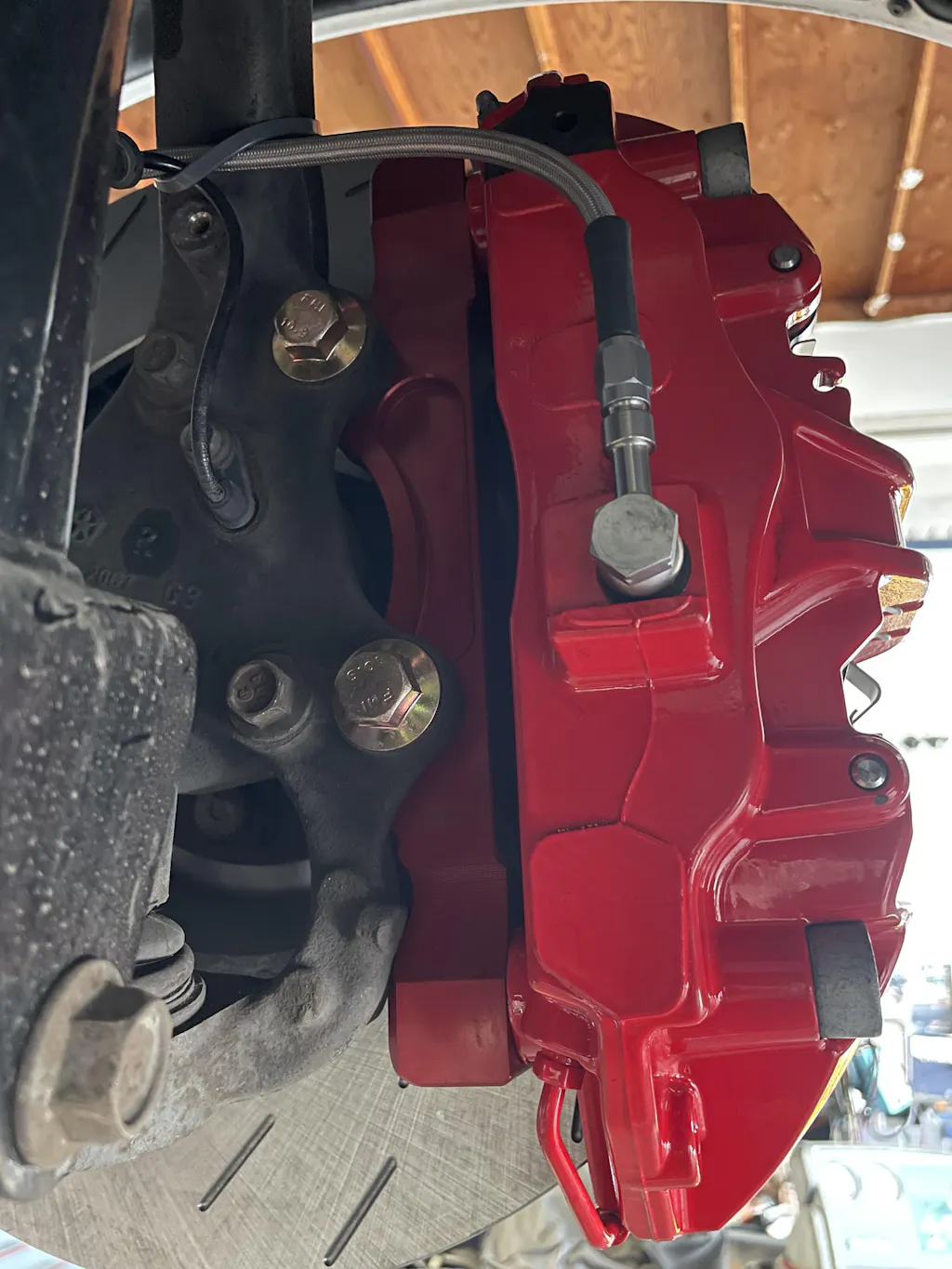 These kits include the calipers, brackets, stainless braided Wilwood hoses, Earl's stainless steel banjos, caliper pins and bolts. Everything you need to put six pistons on your non-srt car. Just add the 2015-2020 Hellcat rotors (15.4"/390mm) and pads of your choice (now included as an option)!