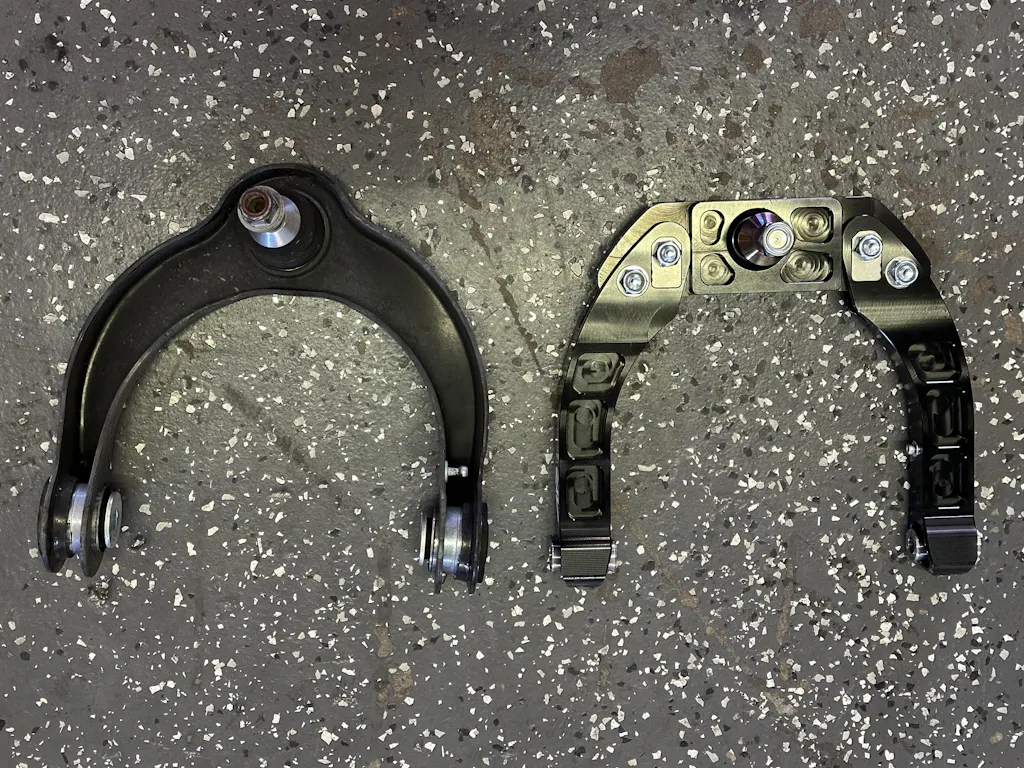 Our parts are all precision machined from 6061-T6511 billet aluminum and 17-4 Stainless steel. Tabs are laser-cut for exact fit, and all hardware is high-strength with OEM-quality plating to resist corrosion. Our arms weigh approximately the same as the OEM parts but are significantly stronger in all directions.